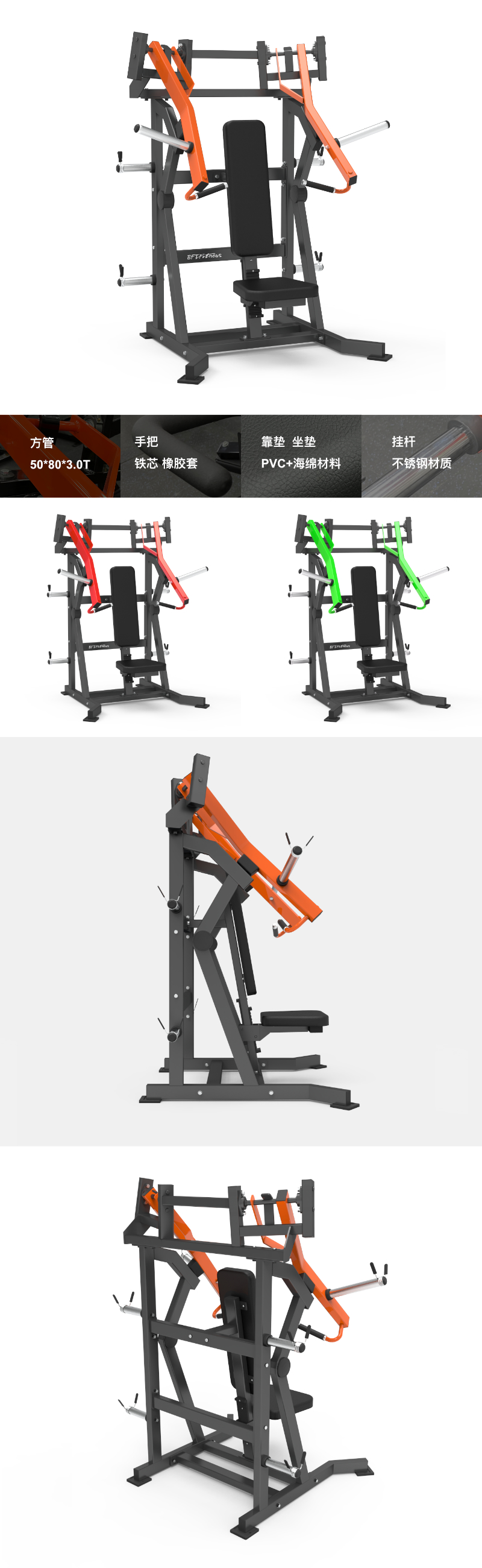 BFT-E01 BFT-E01 坐式分動式推胸訓練器 尺寸: 1610×1480×2000mm 凈重: 159kgs 主管:方管50*80*3.0T 手把:φ25 鐵芯+TPV橡膠套 靠墊/坐墊:PVC+海綿材料 掛桿:不銹鋼材質 最大承重:300kg 獲取報價