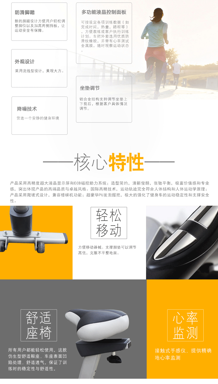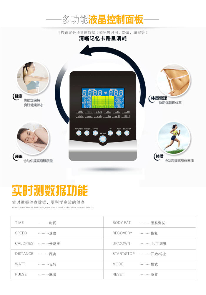 | 心率顯示 | 實時顯示心率,輸入年齡和體重后,可幫助用戶保持在燃脂、有氧或峰值目標區域中,更有效地進進行心肺訓練和減重。 |