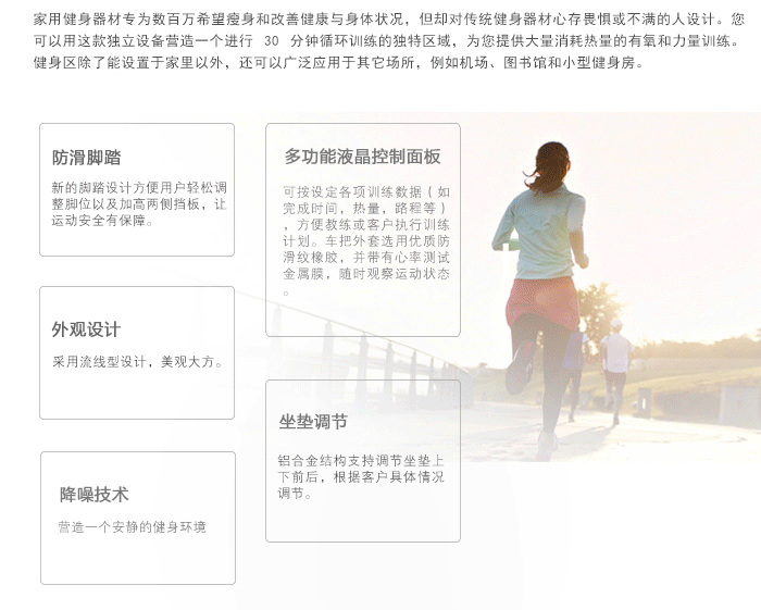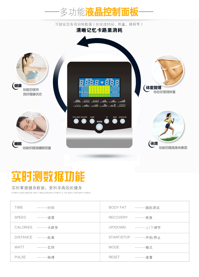 | 心率顯示 | 實時顯示心率,輸入年齡和體重后,可幫助用戶保持在燃脂、有氧或峰值目標區域中,更有效地進進行心肺訓練和減重。 |