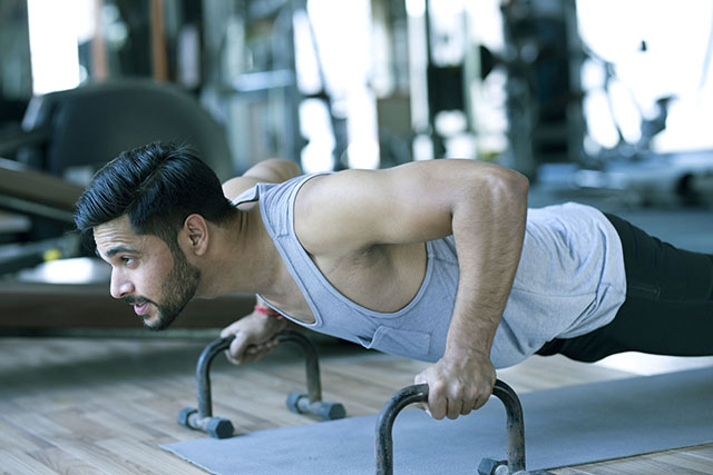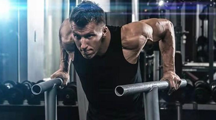 用寬距握俯臥撐架做俯臥撐動(dòng)作,能使肩部下沉更深,能鍛煉到三角肌的前束和中束部位。