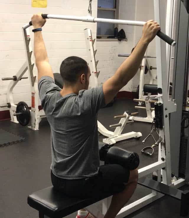 用史密斯架做寬距推伸動(dòng)作,能鍛煉三角肌的前束部位。