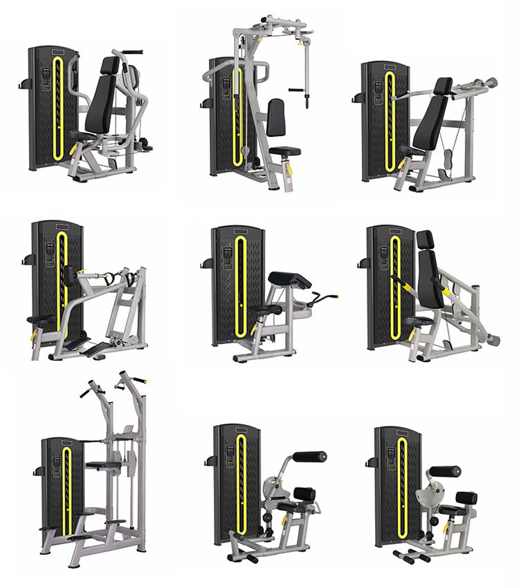 插/掛片式力量健身器材是指通過插入或掛上不同數量的重量片來調節訓練強度的健身器材,通常有固定的運動軌跡和功能,適合初學者和專業運動員使用。包括坐式推胸訓練器、蝴蝶擴胸訓練器、直臂夾胸訓練器、二頭肌訓練器、引體向上訓練器、高拉訓練器、大腿內外展訓練器、輪胎機、45度倒蹬機、多功能腹肌訓練器等。