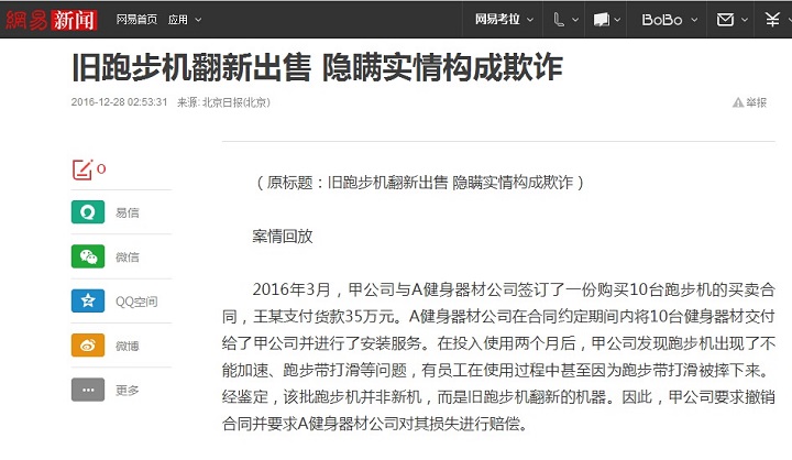 和手機一樣,健身器材當(dāng)然也有翻新機。把舊的健身器材重新打磨,上漆,更換損壞的配件之后出來的就是新機器。這種現(xiàn)象也時常存在,對于采購一方來說,付了同樣的價格拿到一臺舊機器,肯定不會是一件美事。