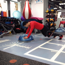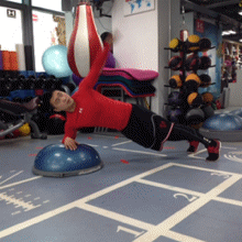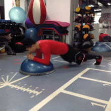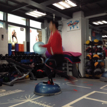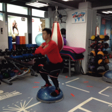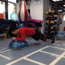三個動作為一次循環,上肢,下肢,核心。 強度從低到高,逐步遞增,每組可做12-20次,間歇時間一分鐘。 (如無BOSU的可在地面上完成)可提高肌耐力,心肺功能,肌肉爆發力。