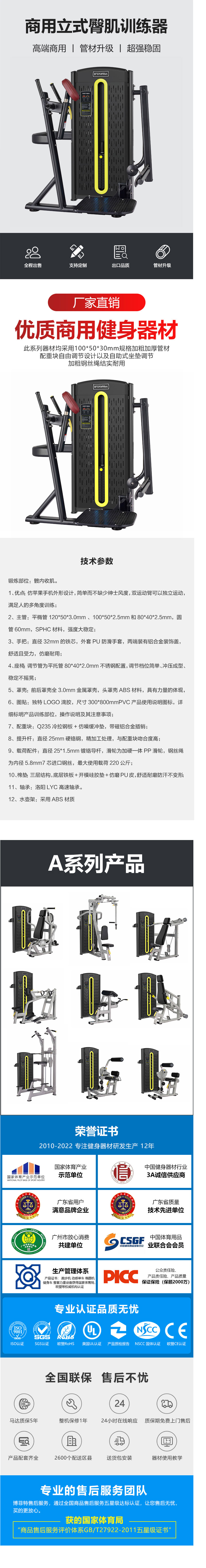 9、載荷配件:直徑25*1.5mm鍍鉻導(dǎo)桿,滑輪為加硬一體PP滑輪,鋼絲繩為內(nèi)徑5.8mm7芯進(jìn)口鋼絲,最大使用載荷220公斤;