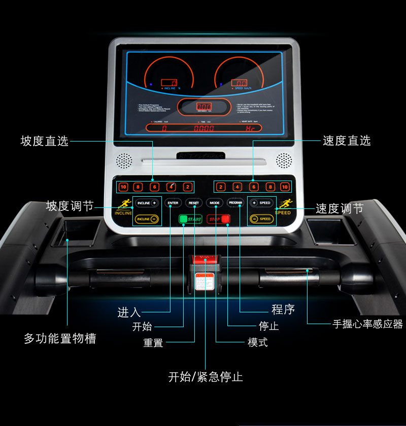 坡度直選功能、軟停止及總里程記錄功能、心率控制速度功能 |