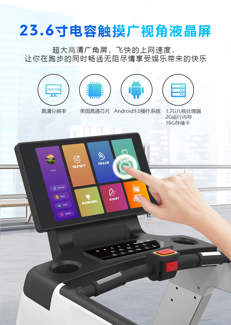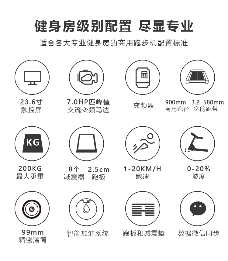 加油系統:手動或者自動加油系統; 跑板厚度:25mm 厚的高強度防靜電跑板; 上邊踏板和側邊踏板:高強度加硬PVC材質,立柱: Q235鋼材; 高加強版的整體鋼架結構提高整體跑步機穩定性